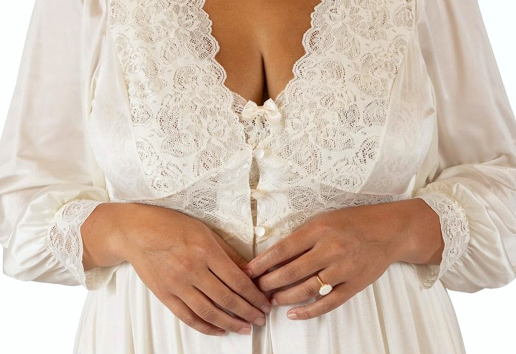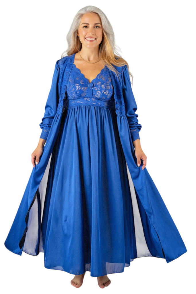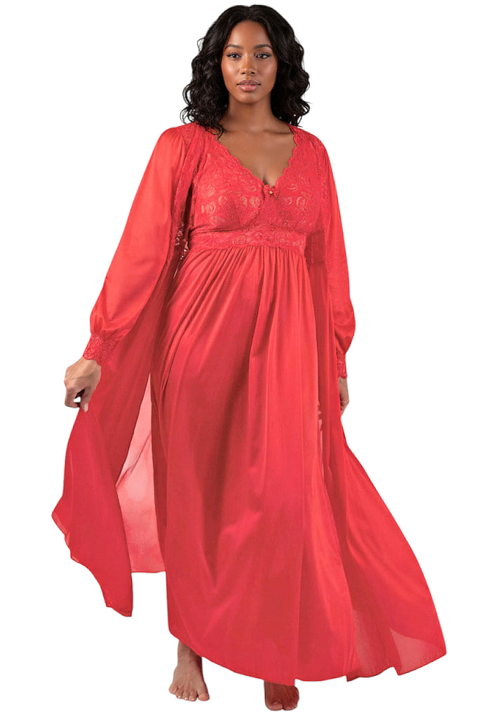 Designed for women who appreciate classic style and luxurious comfort, this silky two-piece sleepwear set features a beautifully detailed lace bodice, a lightweight flowing nylon gown, and a matching robe that drapes effortlessly.