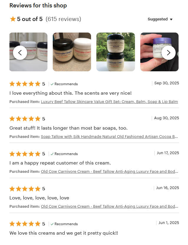 I learned that "back in the day" women used tallow to moisturize their skin and made soap out of it. So I got to work trying to make an all-natural cream that wasn't too greasy and smelled nice. That was over 15 years ago. My tallow cream formula has improved over the years and it just gets better and better.