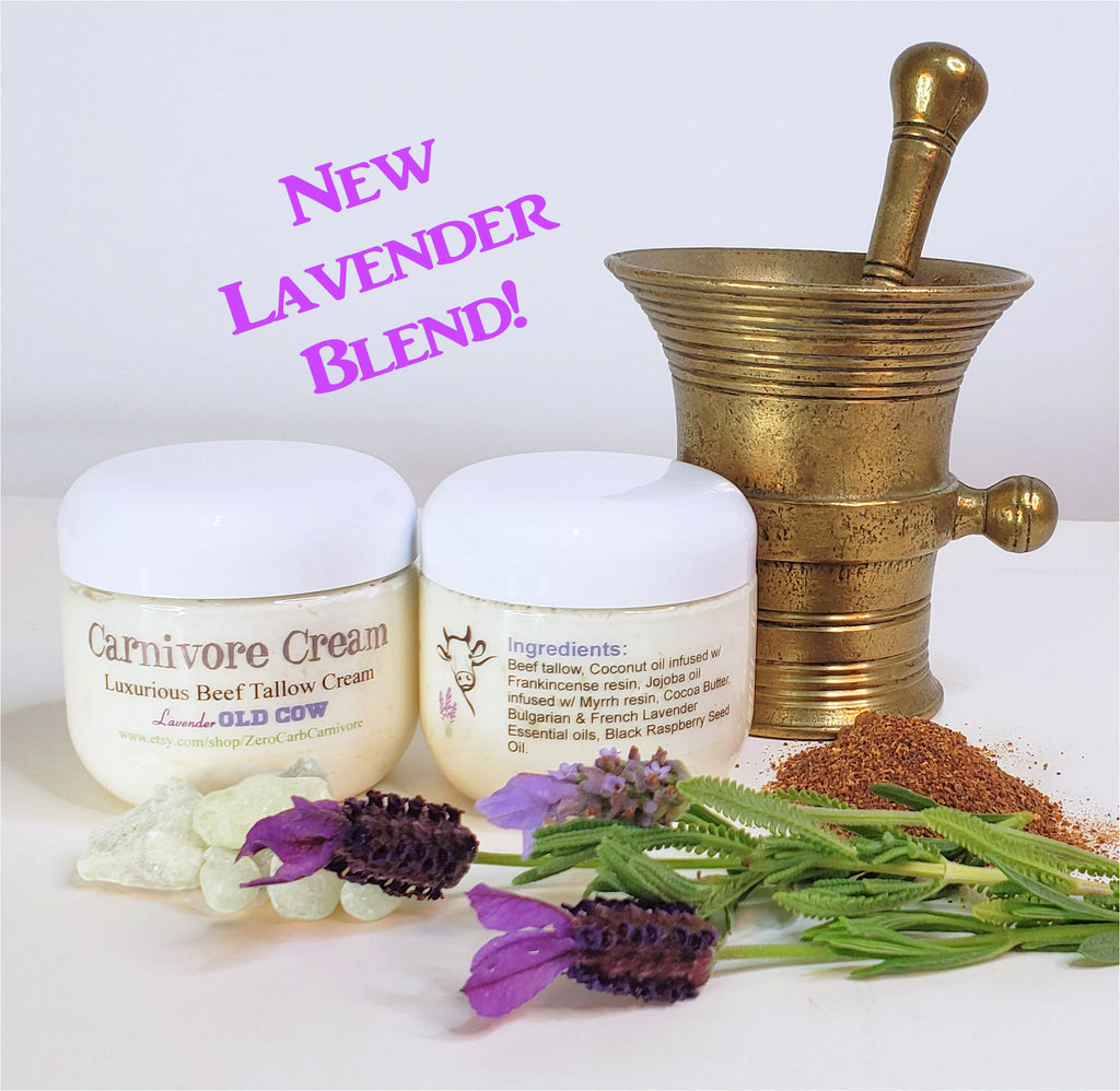 Old Cow Cream Ingredients: Beef Tallow, infused with Frankincense Boswellia Sacra resin and Myrrh resin, Cocoa Butter, Coconut Oil, Lavender and Orange essential oil, Vitamin E.